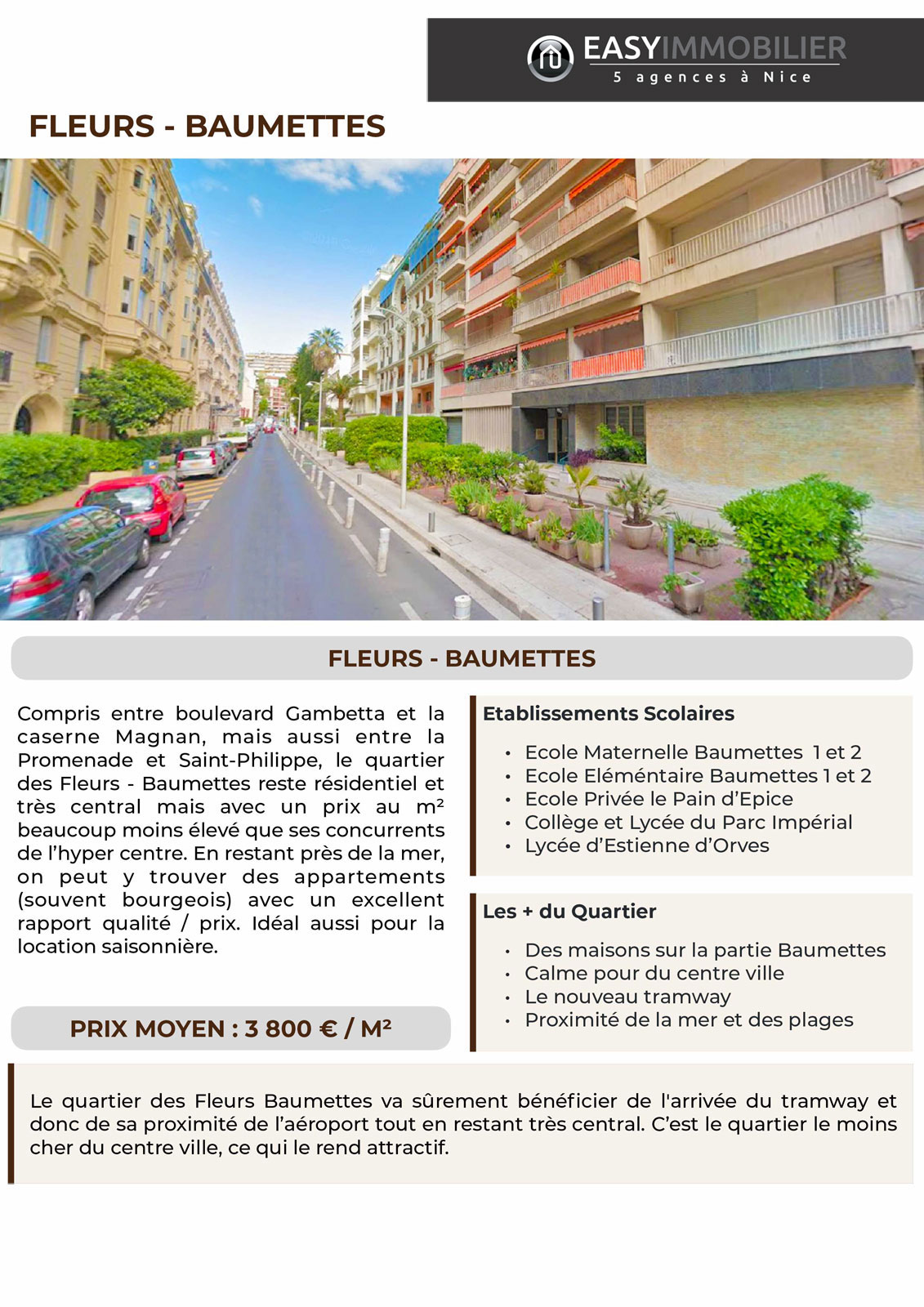 Le quartier des Fleurs Baumettes va sûrement bénéficier de l'arrivée du tramway et donc de sa proximité de l’aéroport tout en restant très central. C’est le quartier le moins cher du centre ville, ce qui le rend attractif.
