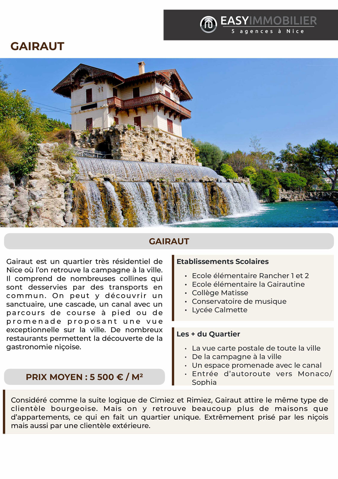 Gairaut est un quartier très résidentiel de Nice où l’on retrouve la campagne à la ville. Il comprend de nombreuses collines qui sont desservies par des transports en commun.