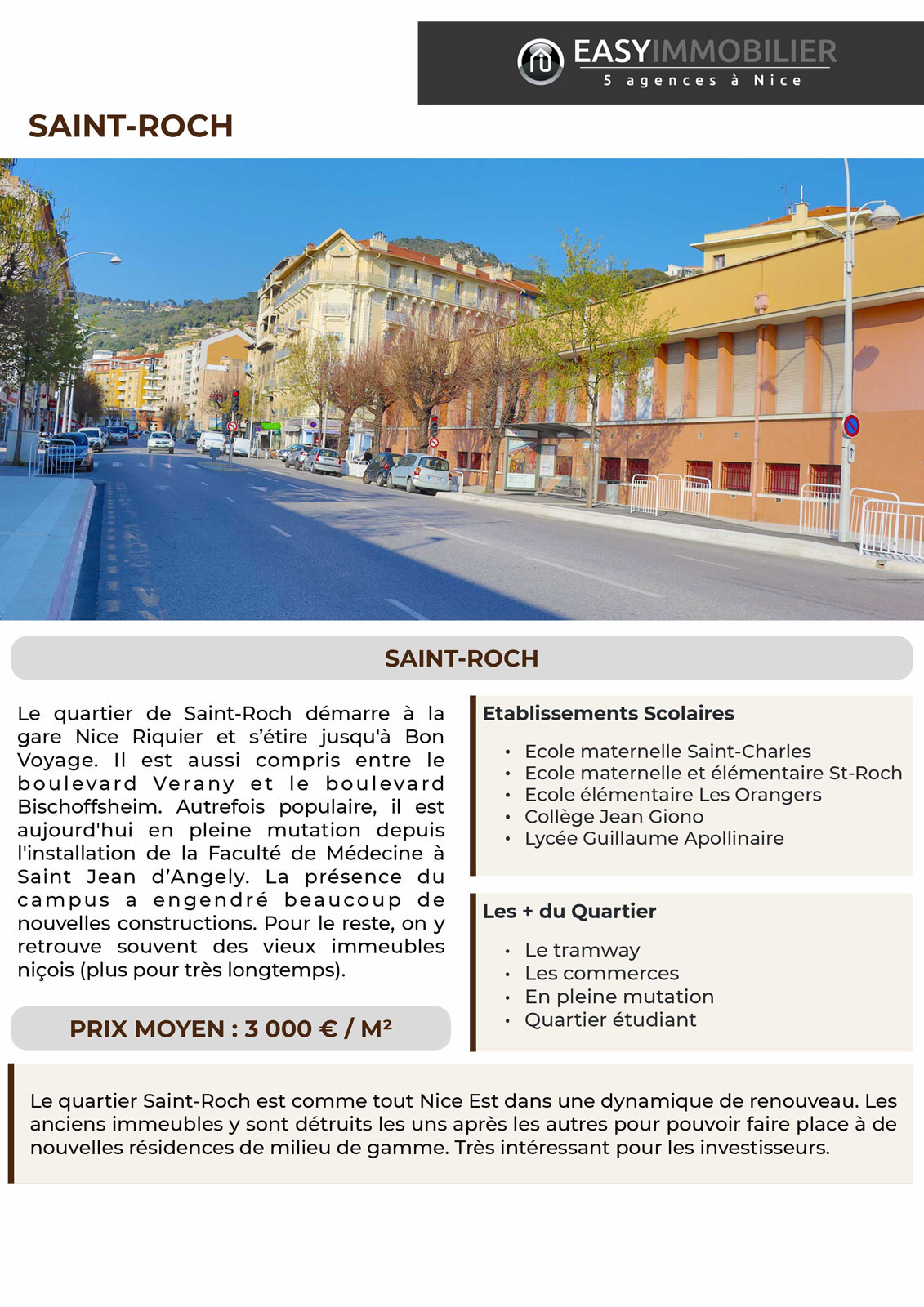 Le quartier Saint-Roch est comme tout Nice Est dans une dynamique de renouveau. Les anciens immeubles y sont détruits les uns après les autres pour pouvoir faire place à de nouvelles résidences de milieu de gamme. Très intéressant pour les investisseurs.